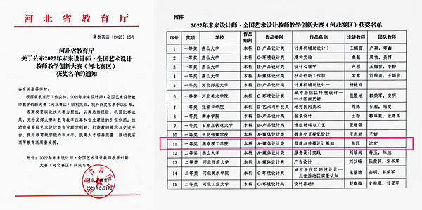 本网讯(艺术学院 陈旺)近日,河北省教育厅公布了《2022年未来设计师·全国艺术设计教师教学创新大赛(河北赛区)获奖名单的通知》(冀教高函〔2023〕15号),河北赛区共评选出37个奖项,经过层层选拔,燕京理工学院沈宏、陈旺老师共同申报的创新教学课程项目《品牌与传播设计基础》课程荣获一等奖佳绩。由河北省科学技术协会指导、河北省科普作家协会主办,河北美术学院与河北省科普作家协会与数字艺术委员会联合承办的河北省首届动漫原创大赛获奖名单揭晓,燕京理工学院选送的艺术与科技专业共创团队数字艺术3套作品,在全省347套数字艺术作品中脱颖而出,荣获大赛“一等奖”3项,沈宏、陈旺等指导教师获“优秀指导教师奖”。