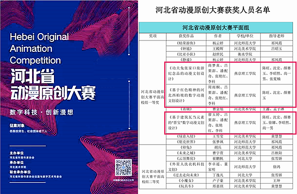 未来设计师·全国艺术设计教师教学创新大赛由工业和信息化部人才交流中心主办,入选中国高等教育学会发布的《全国普通高校教师教学竞赛项目》,共有来自365所高校1727名教师的740门课程参赛,是国家教育部认可的56项全国高校顶级国赛教学类赛事项目之一,具有广泛影响力。河北省首届动漫原创大赛以“数字科技·创新漫想”为主题思想,鼓励原创,激发创新思维,展示全省数字艺术与科技创新成果,传播科技创新和产学研融合的育人理念。燕理艺术与科技专业师生揽获3项大赛”一等奖”,充分证明了学校艺术类人才培养水平,学校育人成果丰硕。