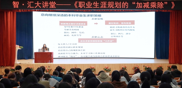 本网讯(就业指导与校企合作中心 李艳杰)为进一步增强同学们的职业生涯规划和职业发展意识,提升自我认知水平与职业探索能力,更好地规划在校生活,树立正确的职业发展目标。4月27日,我校组织开展“智·汇大讲堂”主题讲座。本次讲座特别邀请中央财经大学就业指导中心就业服务部负责人张笑慈老师,带来一场主题为《职业生涯规划的“加减乘除”》的精彩讲座。