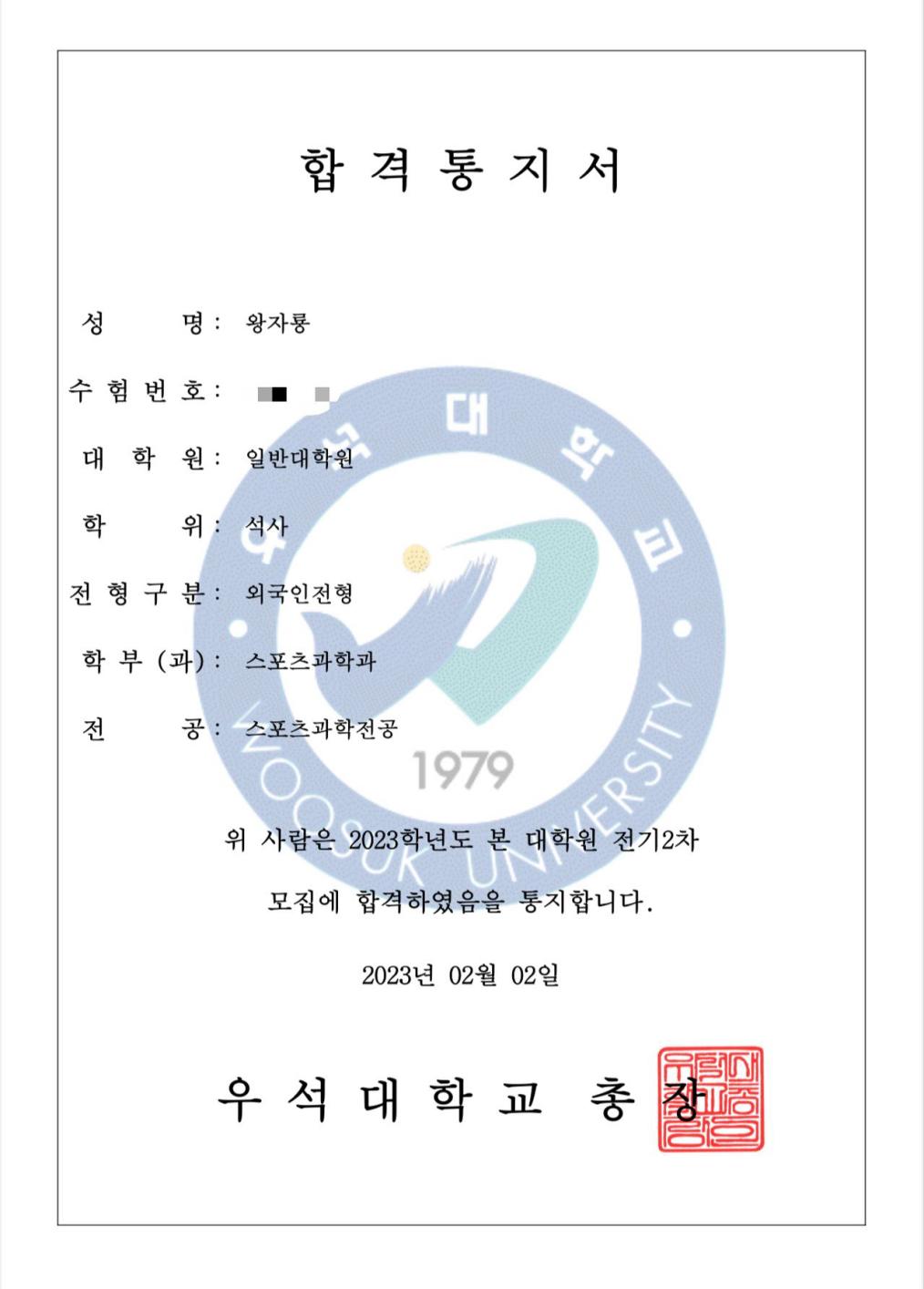 谈起为何选择报名本专硕直通项目,他表示,通过体育学院的老师了解到学校为燕理学子搭建了海外深造的平台,并配有国内外优质教育资源、优秀师资、全程导师陪伴、个性化培养方案等便捷化渠道。在如此便利的条件下,王子龙果断选择了报名。通过向国际教育学院老师咨询,他了解到又石大学的体育专业在韩国名列前茅,于是他开始制定计划,认真学习专业知识,努力提搞自己的GPA和韩语成绩,最终通过自己的努力实现自己的目标。