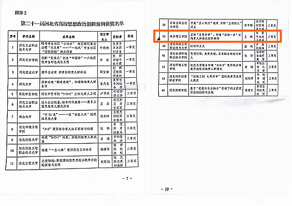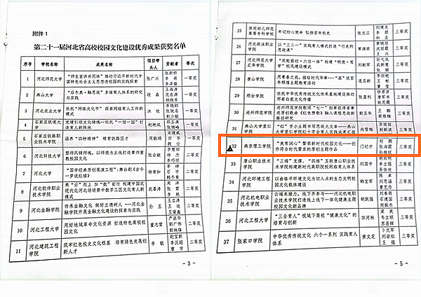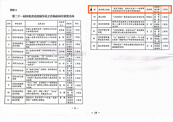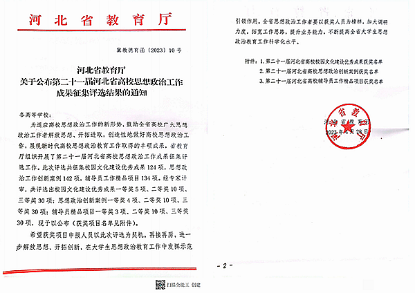 本网讯(宣传部 刘婷婷)为适应高校思想政治工作的新形势,鼓励全省高校广大思想政治工作者解放思想、开拓进取,创造性地做好高校思想政治工作,展现新时代高校思想政治教育工作取得的丰硕成果,省教育厅组织开展了第二十一届河北省高校思想政治工作成果征集评选工作。此次评选共征集校园文化建设优秀成果124项,思想政治工作创新案例142项,辅导员工作精品项目134项。经专家评审,共评选出校园文化建设优秀成果一等奖5项、二等奖10项、 三等奖30项;思想政治创新案例一等奖4项、二等奖10项、三等奖30项;辅导员精品项目一等奖3项、二等奖10项、三等奖30项。
