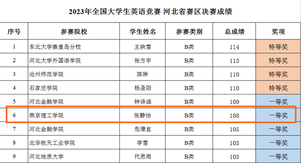 第二十五届全国大学生英语竞赛在全国31个省级赛区约1300余所高等院校中进行了初赛选拔,此次竞赛分A、B、C、D四个类别,全国各高校研究生及本、专科所有年级学生均可采取自愿报名、学生认证的方式参赛。燕理学子积极报名参加,并通过初赛选拔,最终选出12名优秀学生代表,由文法学院教师杨婧带队赴石家庄参加第二十五届全国大学生英语竞赛决赛。