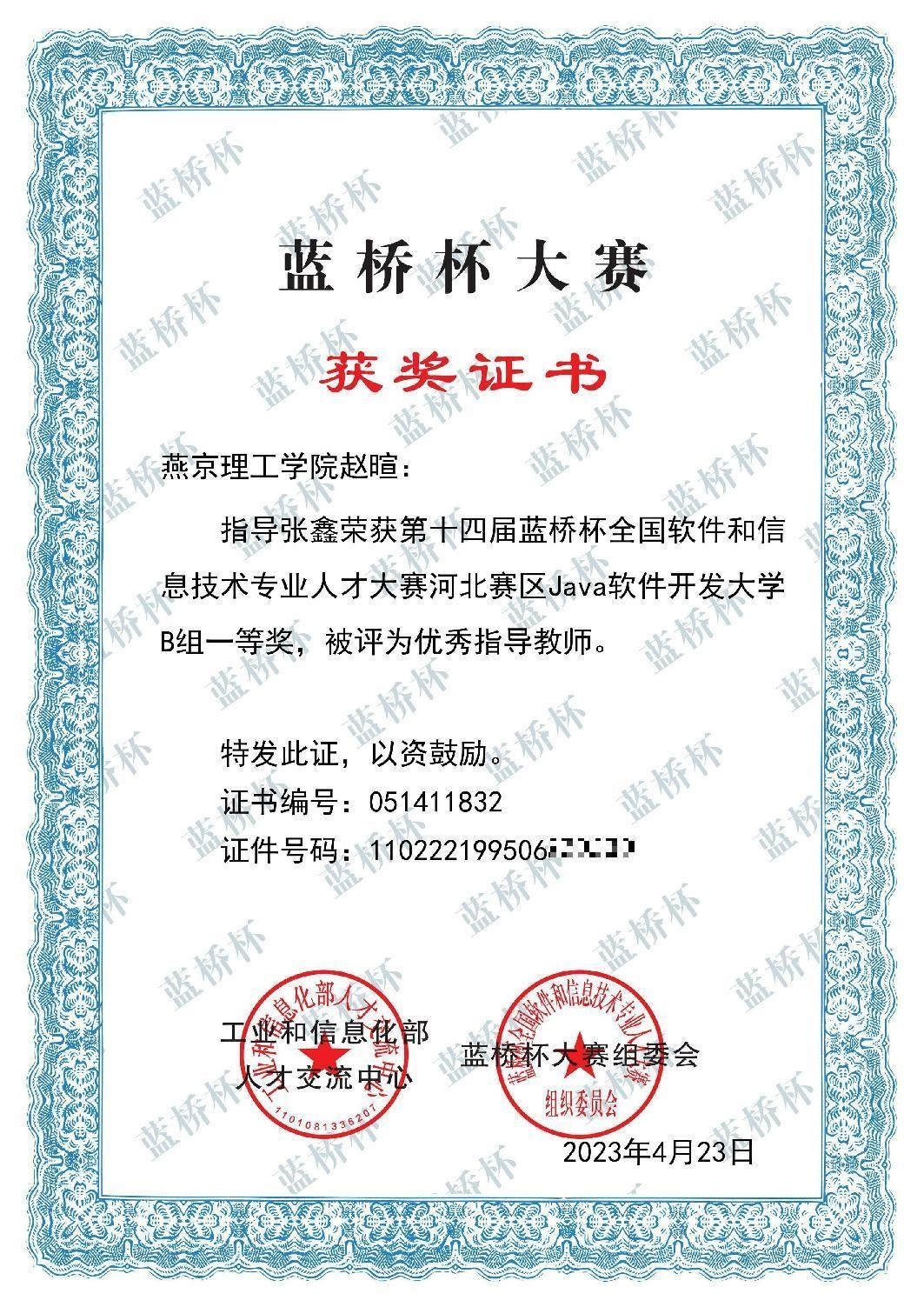 据悉,蓝桥杯是中国计算机类专业学生的一项重要比赛,每年都吸引了来自全国各地的优秀学生参加。张鑫同学是近三年来燕京理工学院首位蓝桥杯中获得国家级奖项的同学。赵暄老师是张鑫同学的指导老师,张鑫同学说:“在比赛期间,赵暄老师为我答疑解惑,帮助我出色完成比赛。”因此,赵暄老师在本次比赛中被评选为优秀指导老师。