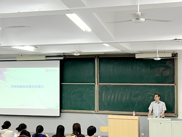 王振方教授全面地向学生讲解了早期接触临床的概念、意义、形式和要求,通过“早临床、多临床、反复临床、持续临床”,达到医学生思维模式由重点思维向系统思维、分科思维向整体思维、慢思维向快思维的转变。他鼓励同学们充分利用暑期,根据自身情况及个人意愿进入各医疗机构积极见习,见习内容可从熟悉医疗机构环境、了解病人入院出院流程、科室查房、交接班等基础工作开始,逐步深入,也可进入到基层医院了解健康档案信息录入,“三高”疾病普查、老年病普查等,还可以进入养老院,了解老年人特点、常见老年病及特点、养老院护理工作内容等。