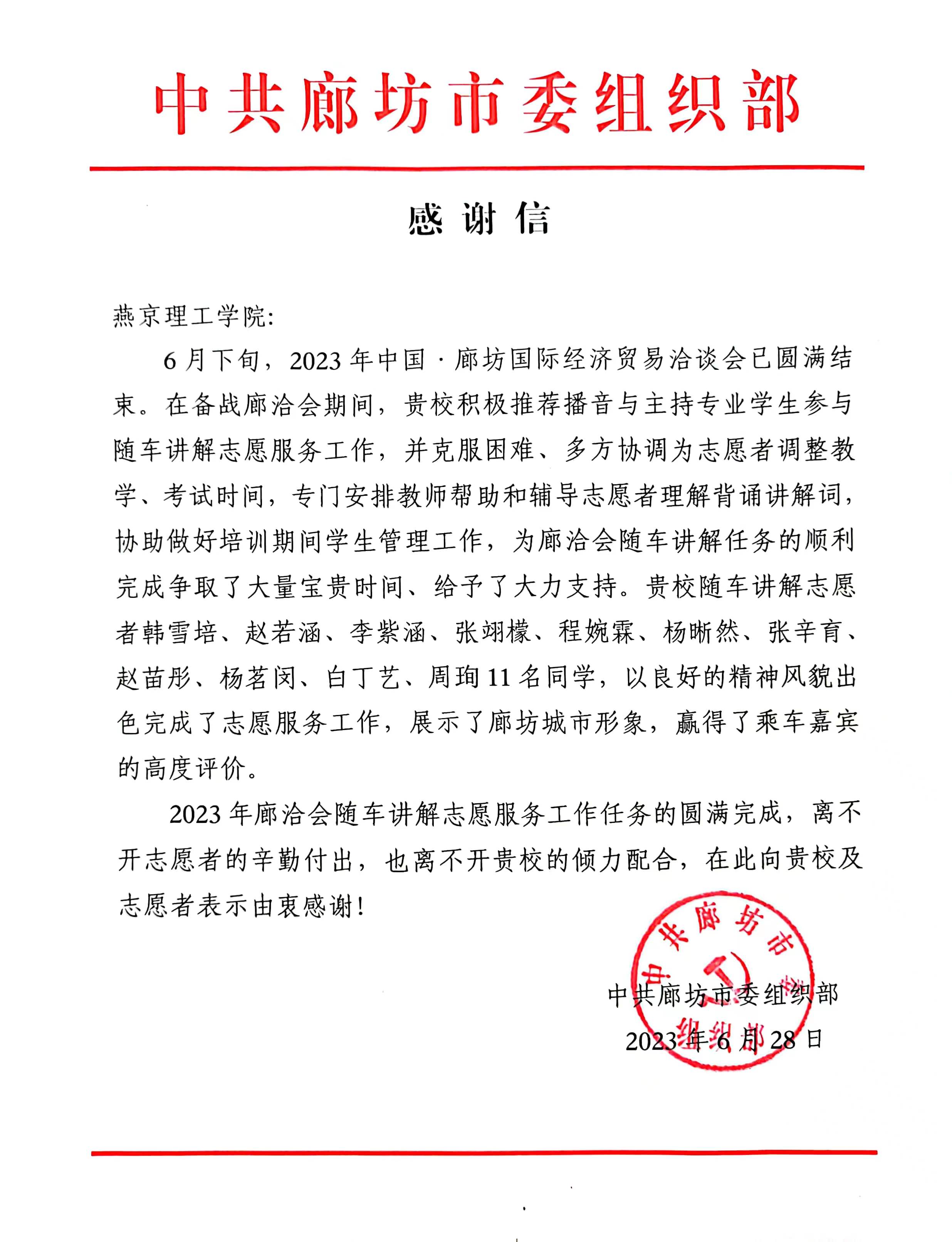 本网讯(传媒学院 李莹)“2023年廊洽会随车讲解志愿工作的圆满完成,离不开志愿者的辛勤付出,也离不开贵校的倾力配合,在此向贵校及志愿者表示由衷感谢!”7月1日,燕京理工学院传媒学院收到了一封来自中共廊坊市委组织部的感谢信,信中对传媒学院2022级播音与主持艺术专业学生韩雪培、赵若涵、李紫涵、张翊檬、程婉霖、杨晰然、张辛育、赵苗彤、杨茗闵、白丁艺、周珣11名同学参加2023年中国·廊坊国际经济贸易洽谈会志愿服务工作给予了感谢和表扬。