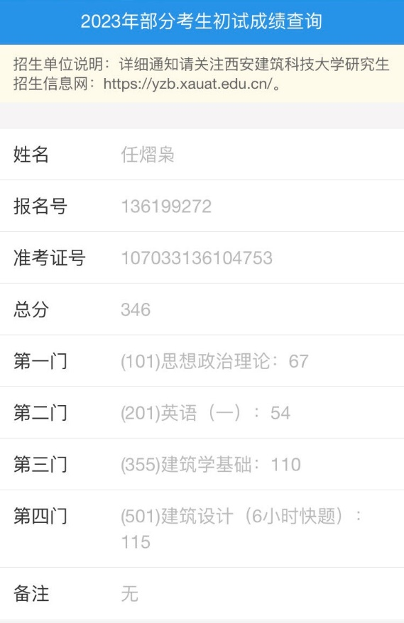 任熠枭的初试成绩
