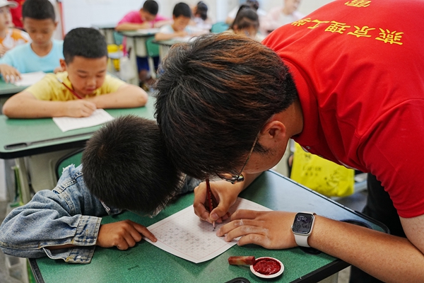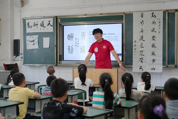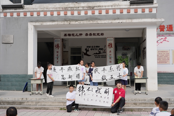 “老师,你看我写得对不对,这幅画的配色好不好?”“用彩纸剪出的小兔子真是活灵活现”“原来汉字还有这么多讲究……”一声声呼唤让承担剪纸、书法课教学任务的阴嘉诚应接不暇。“来这之前,我和其他实践队员认真调研了平通羌族乡中心小学的课程设置,通过综合考量,在支教中增加了手工、书法、国画、剪纸、声乐等兴趣课程,不仅弘扬了中华优秀传统文化,也丰富了整个支教环节的课程内容。”实践队员各展所长,揉捏剪搓粘,妙手生花体验手工乐趣。皴擦点染勾,纸墨笔砚感悟国画精髓。书法课上,实践团成员阴嘉诚从汉字历经几千年发展演变的深情讲述,到汉字笔画书写要领的解析,沿着“听、看、学、练、评、改”的教学思路,引导学生感悟中华语言文字的无穷魅力。文化与实践相融,音乐与美术共鸣,优秀文化的传承,艺术之美的展现对平通羌族乡中心小学的孩子们德智体美劳全面发展产生了积极影响。