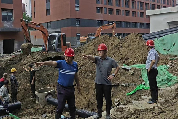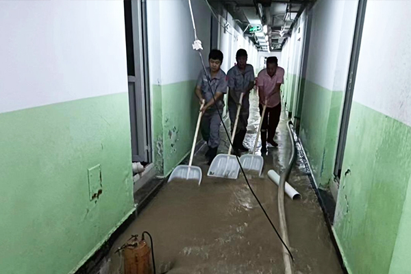 汛情就是命令,强降雨开始后,后保人员全员到岗保障校园防汛运转,由于降雨持续不断,校内部分低洼区域形成积水,部分楼宇出现渗水倒流,后勤团队冒雨巡查及时清除排水口杂物,保持下水暗沟畅通。11台水泵全功率开启及时抽出雨水,防止倒流。