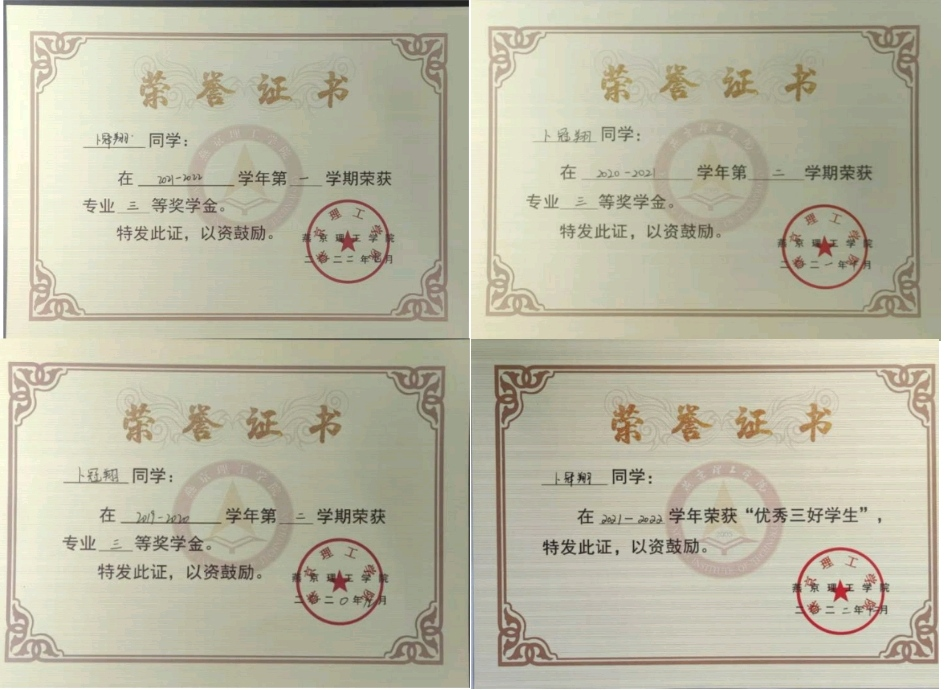 卜冠翔的获奖证书(部分)