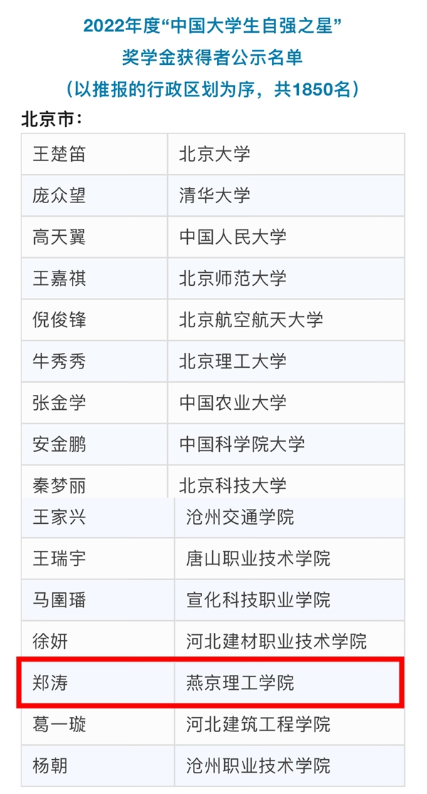 燕京理工学院学子郑涛荣获2022年度“中国大学生自强之星”奖学金