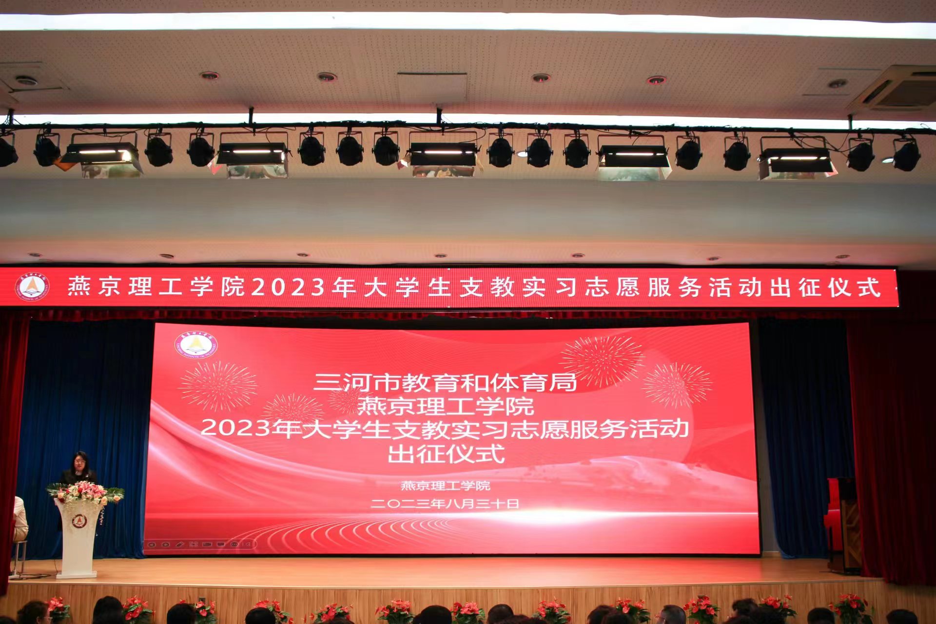 本网讯(学生处 朱秋宜 王欣钰)“作为一名支教实习志愿者,我承诺全心全意投入教育事业……以身作则,严于律己,以榜样的力量激励学生们追求卓越。我将携手同仁,共同为教育事业贡献力量,为学生们的未来播撒希望的种子。”200名支教实习志愿者在报告厅宣誓,表达对支教实习工作的决心和承诺。8月30日,燕京理工学院2023年大学生支教实习志愿服务活动出征仪式在报告厅召开,三河市教育和体育局一级主任科员李建壮及相关工作人员、28所幼儿园和中小学校长,燕京理工学院人文教育学院陈仲利院长、学生处处长宣银及200名支教实习志愿者等参加出征仪式。