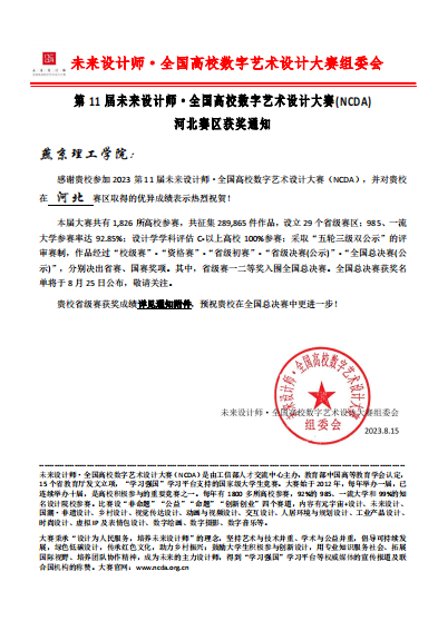 本网讯(艺术学院 安思达)近日,第11届未来设计师·全国高校数字艺术设计大赛(NCDA)河北赛区获奖通知正式公布。燕京理工学院艺术学院学子荣获一、二、三等奖。