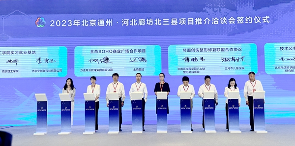 本网讯(艺术学院 邵雷)为加快建设北京市通州区与北三县一体化高质量发展示范区,9月19日,北京通州——河北廊坊北三县项目推介洽谈会在廊坊市大厂回族自治县举办。燕京理工学院艺术学院院长沈宏与数字媒体艺术专业课程群负责人一同参加了本次会议。会上,北京市与廊坊北三县现场签约项目高达50项,意向投资额约426.81亿元,涉及产业、公共服务、交通基础设施、现代服务业等重点领域,其中,我校”燕京理工学院实习就业基地”项目成为签约仪式的焦点之一。