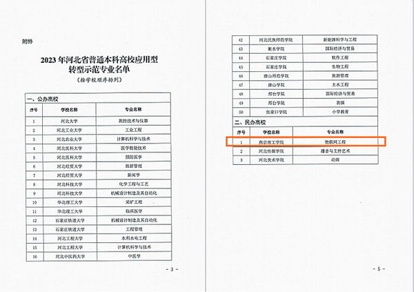 本网讯(教务处 信息科学与技术学院 李颖 蔡小庆)近日,河北省教育厅发布《关于公布2023年度普通本科高校应用型转型示范专业名单的通知》(冀教高函〔2023〕78号),将53个本科专业确定为2023年度河北省应用型转型示范专业,其中公办高校50个,民办高校3个,我校物联网工程专业喜登榜单。