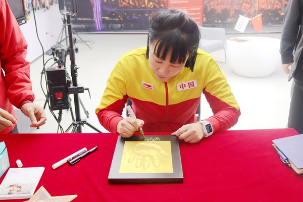 钱红女士对我校体育馆建设提出了宝贵的意见,她表示校园体育馆具有大学属性,是为学生提供身体锻炼的好地方,所以应以服务学生运动需求为主。最后,钱红女士写下寄语并制作冠军手印赠与我校。