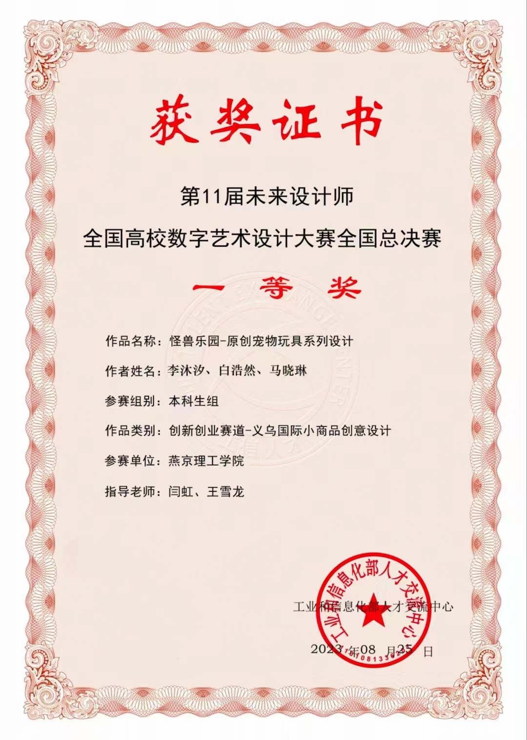 由艺术学院产品设计专业教师闫虹、任佳雯指导,产品设计专业20级李沐汐、马晓琳、白浩然团队作品获得全国高校数字艺术设计大赛国赛一等奖,并获得创新创业赛道银鹁鸪奖,获奖金十万元整。闫虹老师荣获国赛优秀指导教师,燕京理工学院被授予“优秀组织奖”。