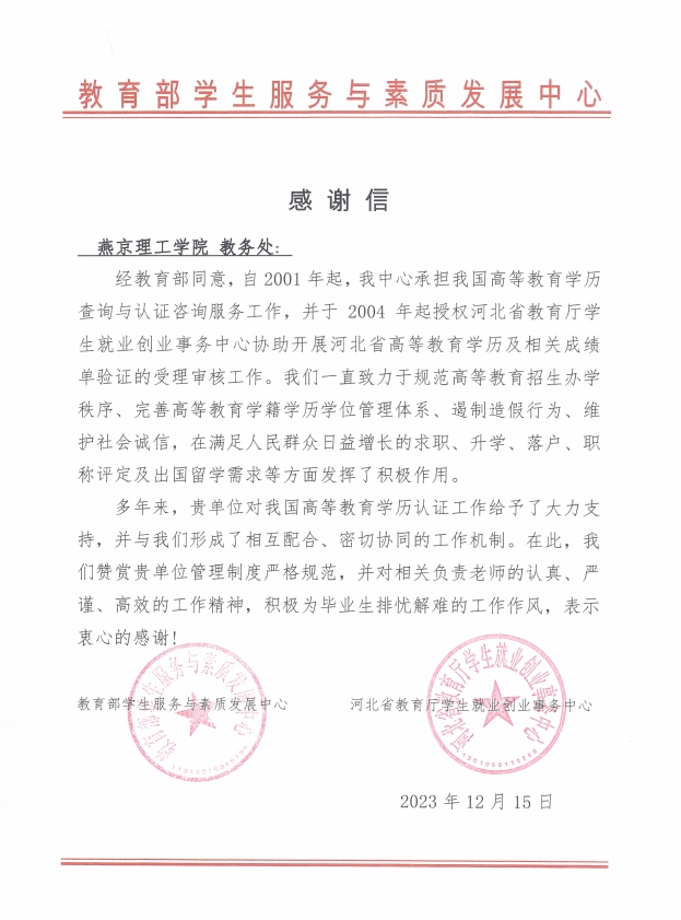 本网讯(教务处 李丽荣)近日,我校收到教育部学生服务与素质发展中心和河北省教育厅学生就业创业事务中心发来的感谢信,信中表达了燕京理工学院教务处对教育部高等教育学历认证工作给予大力支持的感谢,表扬了学校严格规范的管理制度,认真、严谨、高效的工作精神,以及为毕业生排忧解难的服务意识。