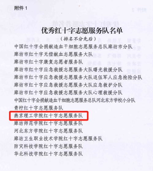 本网讯(环境与健康学院 谢祎晨)近日,廊坊市红十字会发布了关于表彰优秀红十字志愿者和优秀红十字志愿服务组织决定,燕京理工学院红十字志愿服务队荣获了红十字志愿服务优秀组织称号,同时,该队的2名志愿者荣获了优秀志愿者称号。
