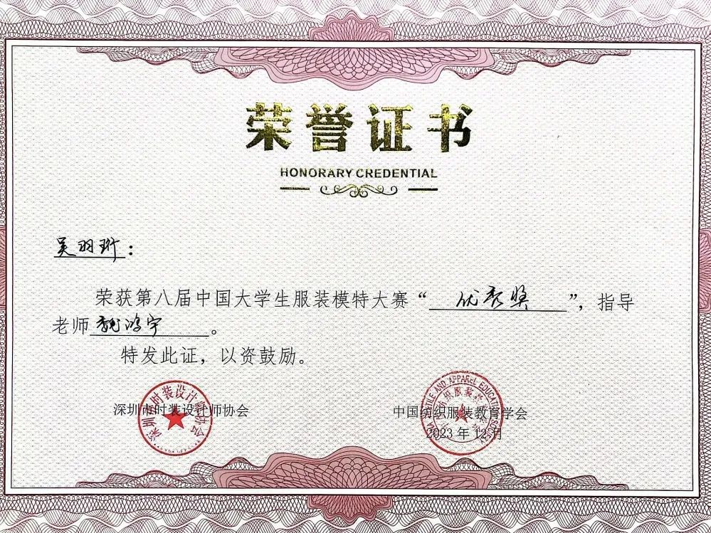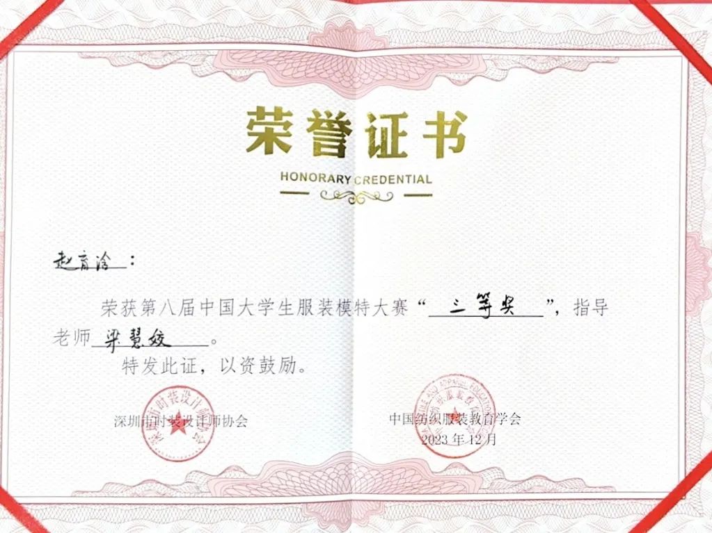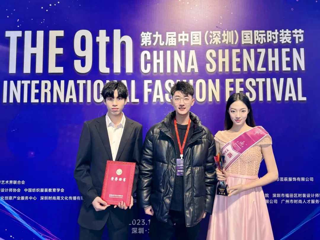 本网讯(艺术学院 吴羽珩)近日,第九届中国(深圳)国际时装节在广东深圳举行,本次模特大赛共有86所高等院校推荐,最终105位服装表演专业学生入围,在服装表演专业教师魏鸿宇、梁慧姣的共同指导下,我校服装表演专业赵育浛荣获全国女子组三等奖,吴羽珩荣获男子组“优秀奖”。
