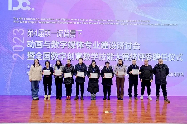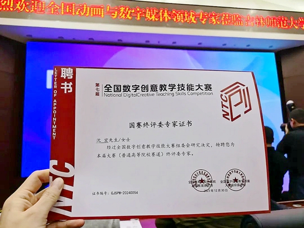 沈宏院长带领的教师团队曾在第五届全国数字创意教学技能大赛(国赛)中斩获一、二等奖。此次,沈宏院长受邀参加动画与数字媒体专业建设研讨会暨全国数字创意教学技能大赛终评委聘任仪式,并被特聘为国赛终评委专家,是各界专家学者、专业教学技能大赛组委会对我校育人成果的充分肯定,也是持续推进教育教学改革与创新的结果。