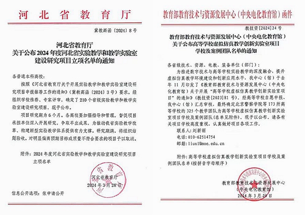本网讯(艺术学院 陈旺)近日,艺术学院获2024年教育部教育技术与资源发展中心(中央电化教育馆)《基于传统文化的虚拟仿真教学创新实验室》虚拟仿真教学创新实验室项目专项课题立项,同时获得2024年度河北省实验教学和教学实验室建设研究项目《艺术设计类专业虚拟仿真实验教学数字化研究》立项,共批2项省级课题立项。