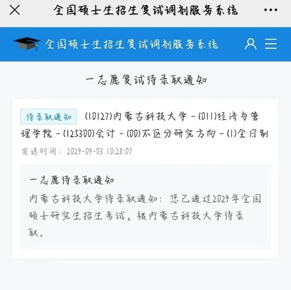 本网讯(会计学院 孙雯 陈丽洁)孙雯是会计学院审计2002班学生,在2024年全国硕士研究生考试中她成功考入内蒙古科技大学。