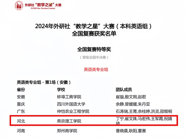 本网讯(人文教育学院 王军霞)近日,2024年外研社“教学之星”大赛全国复赛结果揭晓,人文教育学院商务英语专业教师团队丁宁、崔文姝、马宏伟、王军霞、祝婧琦荣获全国英语专业组全国复赛特等奖,晋级全国半决赛,将于8月3日赴安徽合肥参赛。