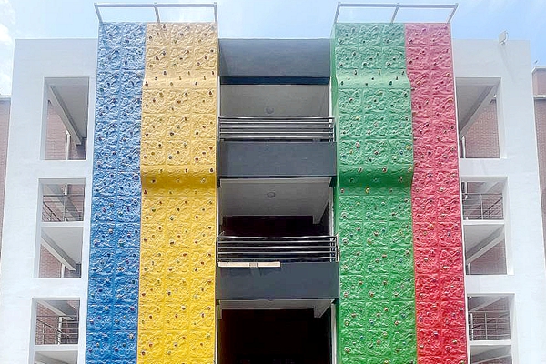 本网讯(体育学院 陈凤浩)近日,我校攀岩墙项目正式竣工。攀岩墙位于E楼东侧,主体构成由左到右为蓝黄黑绿红五个颜色构成,象征着奥运五环的颜色。项目于2024年3月开始建设,历时4个月,于7月主体竣工,主要用于专业课教学和公共体育课程,当前项目已正式交付,可以承载2024—2025学年第一学期的教学工作。