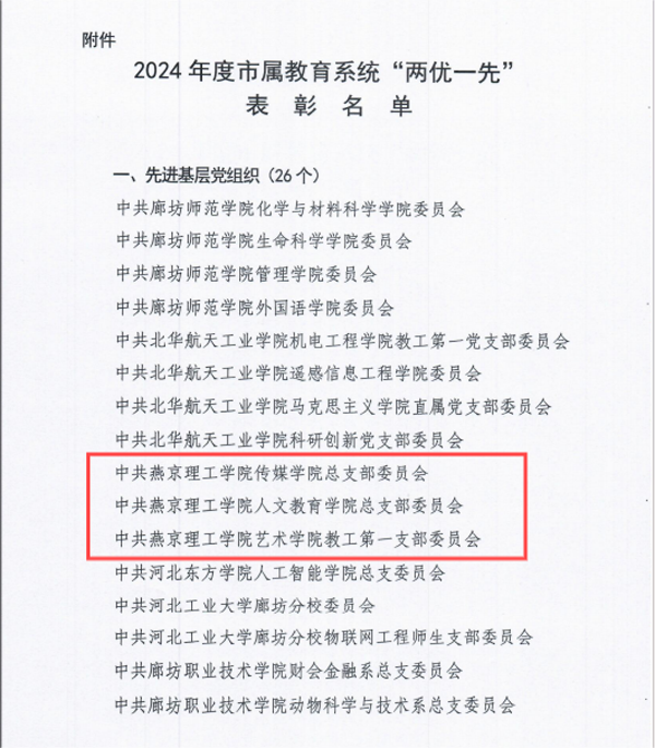 本网讯(党委办公室 郭雯)近日,河北省廊坊市委教育工委发布了2024年度市属教育系统“两优一先”表彰结果,我校传媒学院党总支、人文教育学院党总支、艺术学院教工第一党支部荣获“廊坊市教育系统先进基层党组织”称号,孙昊、周秋宇同志荣获“廊坊市教育系统优秀共产党员”称号,牛玉玲、王思齐同志荣获“廊坊市教育系统优秀党务工作者”称号。