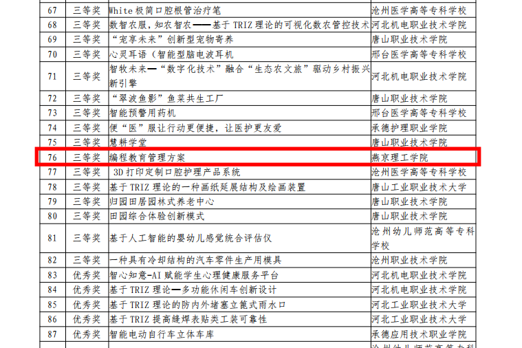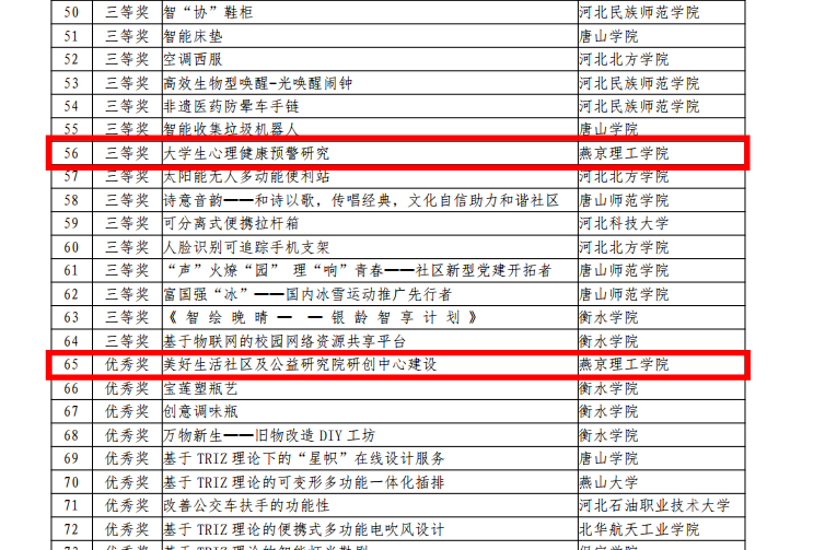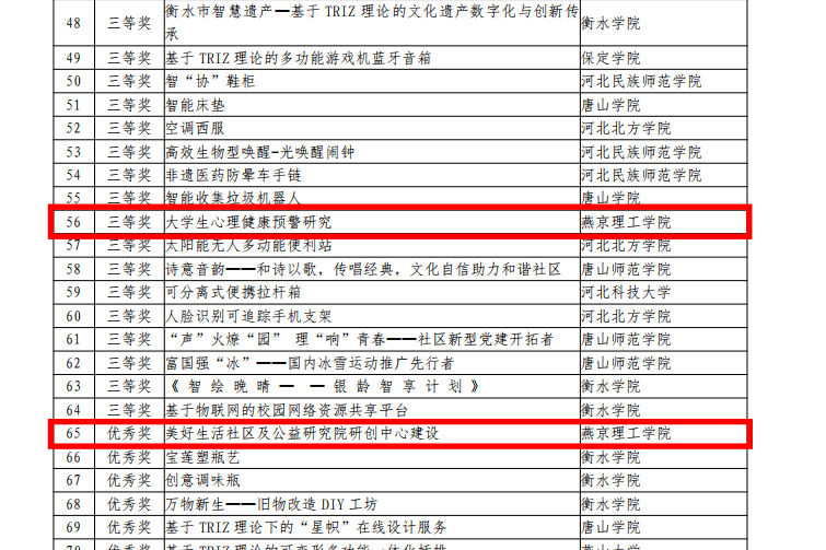 本网讯(学生处 杨文静)近日,河北省科协、河北省科技厅、河北省教育厅、河北省人社厅共同举办的“第五届河北省大学生创新方法大赛”已落下帷幕,燕理学子作品获得一等奖一项,三等奖五项,优等奖三项。