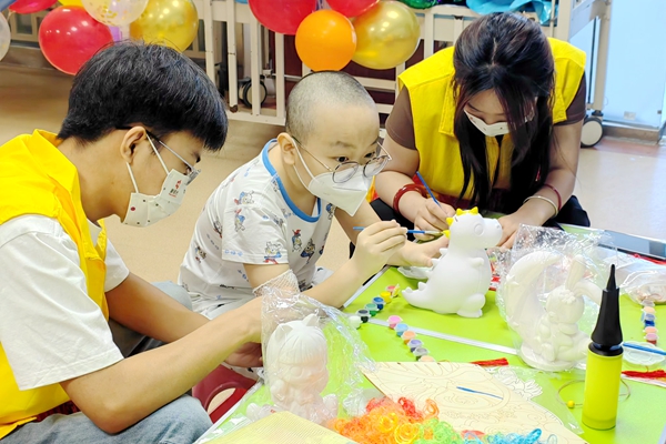 在“新阳光白血病房”的线下志愿服务活动中,国际商学院组织了一批乐于奉献、有责任心的志愿者,他们与小朋友们进行了密切的互动,包括教授绘画技巧、讲述生动故事、陪伴参与游戏等。志愿者们用温柔、亲切的话语与孩子们沟通交流,耐心地为孩子们讲解知识,为小朋友们留下了许多珍贵而美好的回忆。
