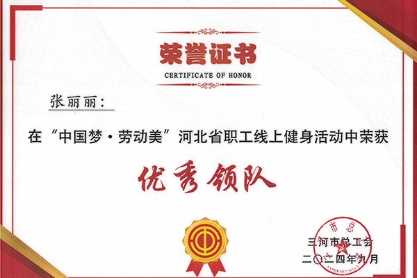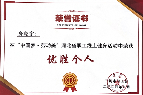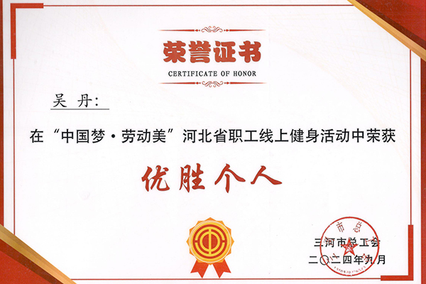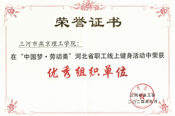 本网讯(燕京理工学院工会委员会)为深入学习宣传贯彻党的二十大精神和落实中国工会十八大工作部署,不断提升职工身体素质,营造健康快乐工作氛围,在燕理践行“体育无处不在”,燕京理工学院工会积极响应号召,组织学校教职工代表参加了“中国梦.劳动美”全国职工线上健身活动,并在活动中获得了多项荣誉。