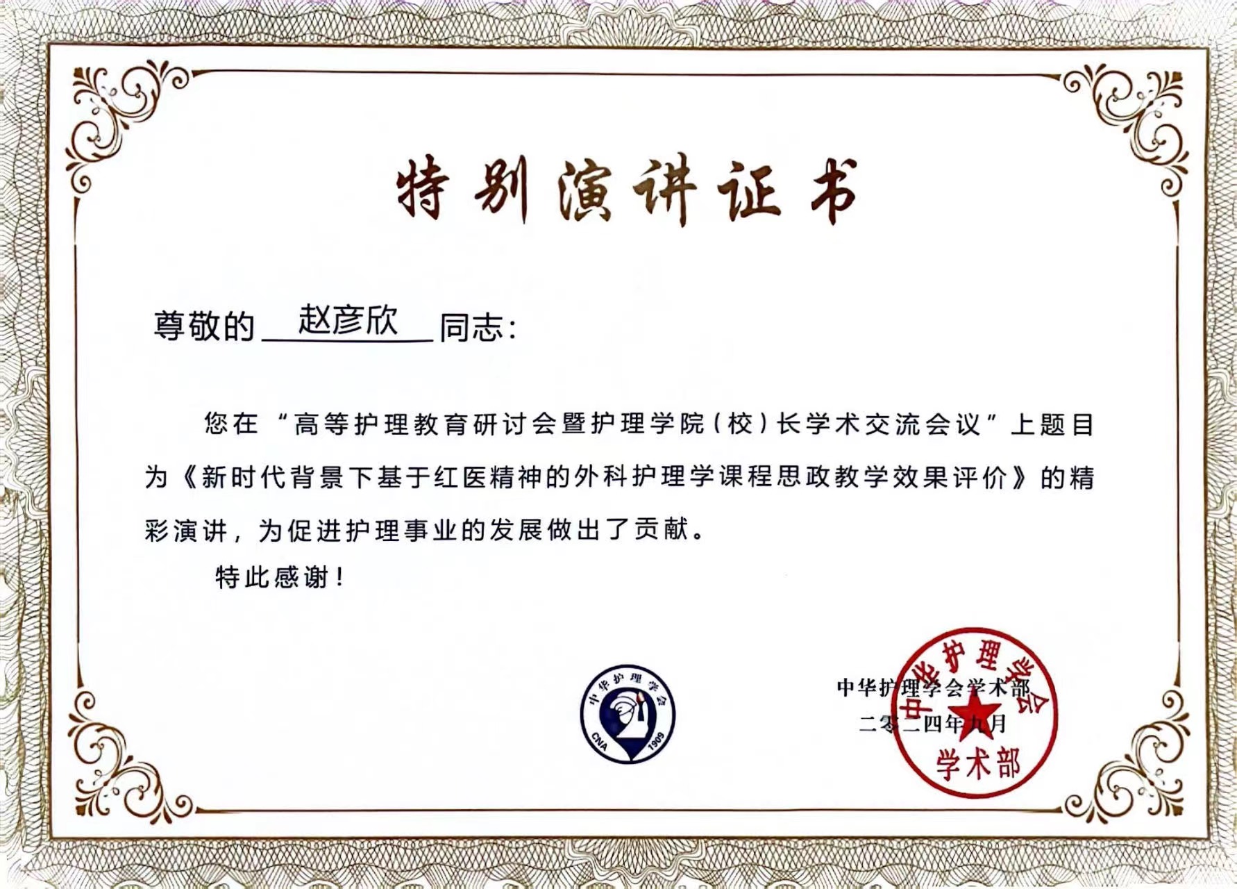 9月22日下午,赵彦欣老师在护理高教分会场进行了题为《新时代背景下基于红医精神的外科护理学课程思政教学效果评价》的大会发言,分享了她在课程思政教学中的创新和经验,包括如何深度落实立德树人的教学手段、以及专业知识与思想政治教育相融合的教学内容,为护理教育者培养更多又红又专的护理人才提供借鉴。大会发言后,赵彦欣老师获得了中华护理学会颁发的“特别演讲证书”。