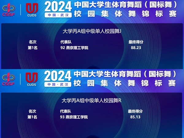 本网讯(体育学院 蒋帅)12月8日至13日,由中国学生体育联合会主办,中国学生体育联合会大学体育舞蹈分会执行,湖北艺术职业学院承办的2024中国大学生体育舞蹈(国标舞)校园集体舞锦标赛在湖北剧院盛大开幕。燕京理工学院体育舞蹈运动队获得大学丙A组中级单人校园伦巴舞和大学丙A组中级单人校园牛仔舞双项冠军。