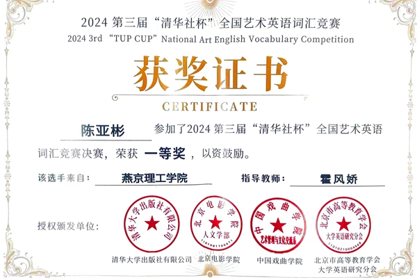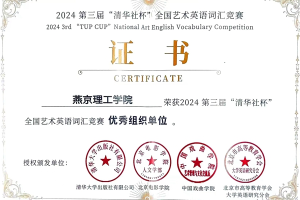 本网讯(人文教育学院 段腾宇)近日,第三届“清华社杯”全国艺术词汇竞赛决赛圆满落幕。由人文教育学院组织选拔的全校多名同学表现优异,斩获全国总决赛一等奖1项、二等奖1项、三等奖4项。同时,燕京理工学院荣获赛事“优秀组织单位”,充分彰显了学校在艺术与语言交叉融合领域的教学实力与育人成效。