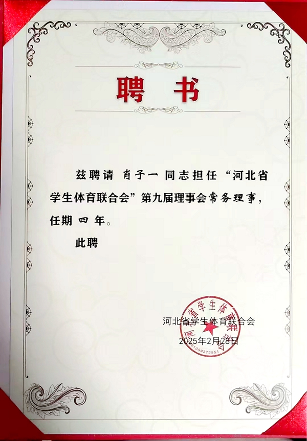 体育学院院长肖子一被聘为“河北省学生体育联合会第九届理事会常务理事”