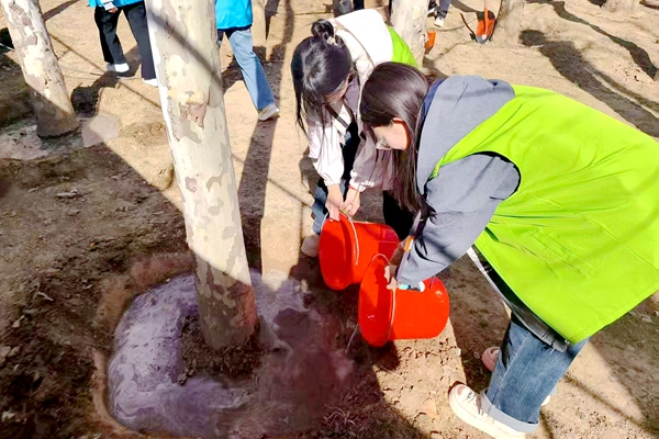 同学们化身”校园园丁”投入劳动实践。活动现场,专业人员首先示范了科学的种植流程,详细讲解培土深度、根系处理等专业知识。随后同学们三人一组分工协作,挥锹铲土、扶正树苗、培土围堰、提水浇灌,各个环节衔接有序。经过两小时的辛勤劳作,30余株海棠、玉兰新苗在二食堂东侧绿地”安家落户”,新栽苗木迎风挺立,与师生劳动的身影共同构成春日校园的靓丽图景。