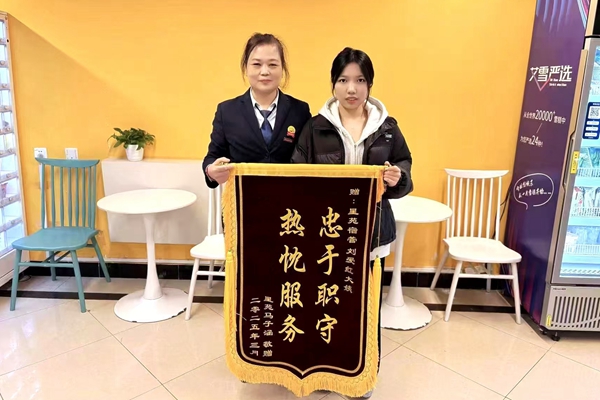 马子涵为宿管阿姨刘爱红赠送锦旗(左为刘爱红,右为马子涵)