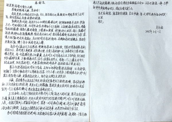 “自己独自爬上六楼都很累,不敢相信在里三层外三层穿衣的冬天,背着一个人上楼是多么大的运动量,趴在您的背上,听着您微微的喘息声,我的泪不禁湿润了……”马子涵的感谢信中再次重温了当时的情景,她满怀感激之情。“上到三楼就感觉累了,但一看孩子的脚肿的走路都不能走,我就想着一定要把她背上去。”回到值班室的刘爱红,衣衫已经被汗水浸湿透了,她仍心系脚扭伤的马子涵。