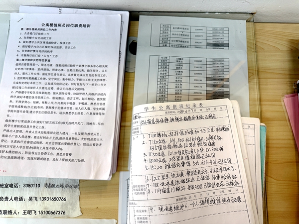 初见刘爱红时,她正在清点暖宫贴、感冒药、退烧药、针线盒等物品。“这些都得随时准备着,万一孩子们身体不舒服能及时用上。”在干净整洁的值班室,刘爱红的笔记上详细地记录着学生最新电话、辅导员电话、宿舍报修情况等,像是一本“学生档案”。