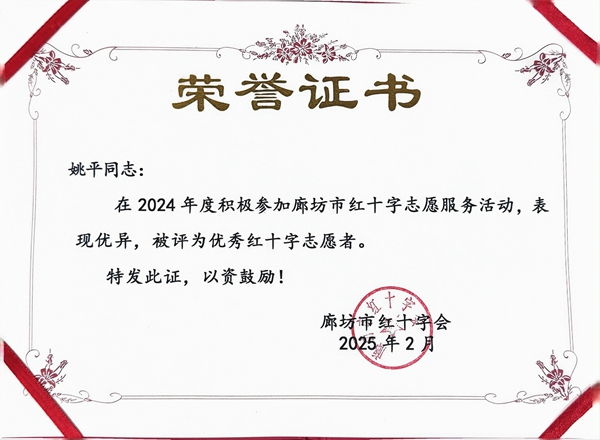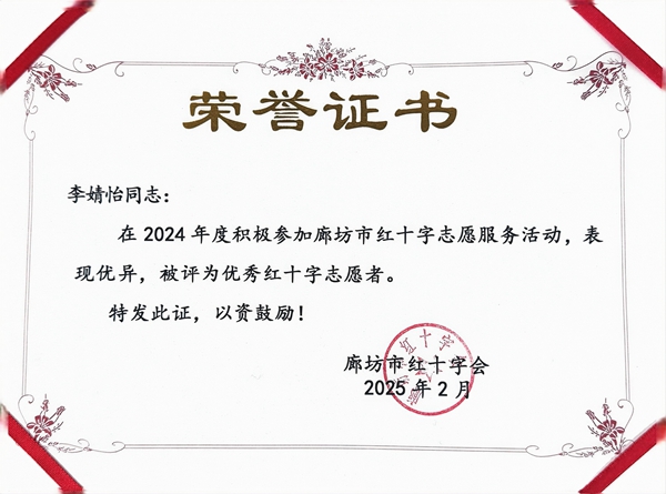 燕京理工学院红十字志愿服务队“优秀红十字志愿服务队”称号,授予姚平和李婧怡2名志愿者“红十字会优秀志愿者”称号