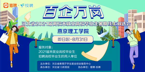 本网讯(就业指导与校企合作中心 李艳杰)在河北省教育厅学生就业创业指导中心与猎聘·校聘的大力支持下,燕京理工学院2021届离校未就业毕业生暑期线上双选会于7月14日正式举办,历时近50天,于8月31日圆满落幕。