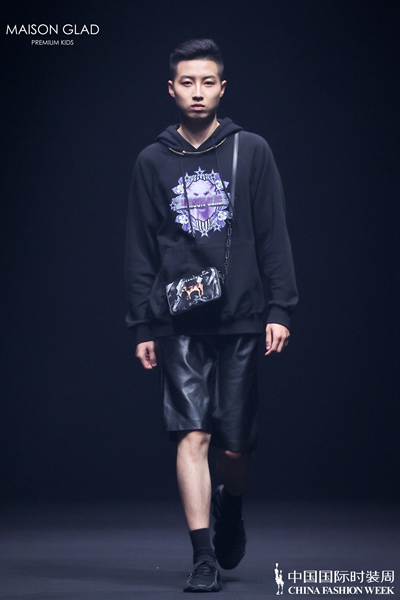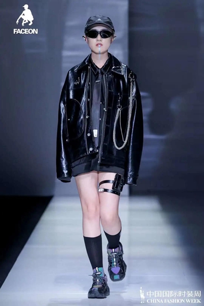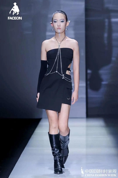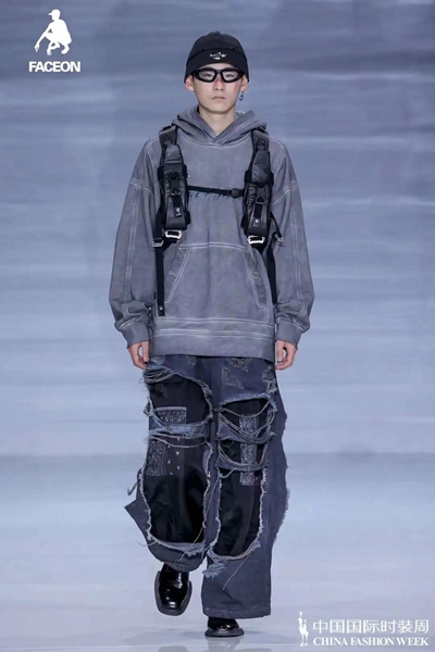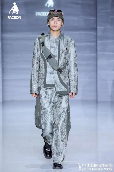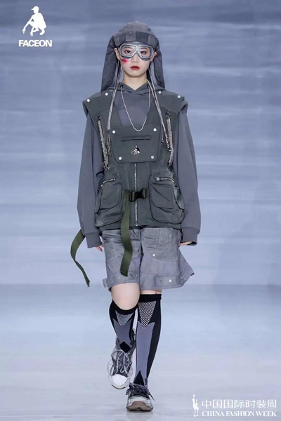 本系列设计在手法上大胆尝试角色代入法,让每一套LOOK,每一个人都拥有独特的身份。中国元素的运用也是本季时装周的一大亮点,解构汉服、机能中山装、金属赛博格盘扣等构建了浓郁的东方赛博美学。