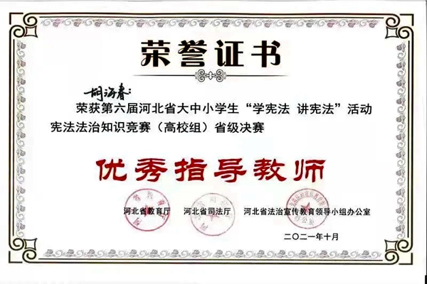 本网讯(学生处 高亚丹)为深入贯彻习近平总书记关于加强宪法法制宣传教育的重要指示精神,认真落实党的十九届五中全会精神。学校积极组织学生参加第六届河北省大中小学生“学宪法,讲宪法”大赛暨全国选拔赛。学生处宋子瑶老师和文法学院胡海春老师在省级决赛中被评为优秀指导教师,文法学院李颖、麻世杰同学分别在宪法法治竞赛、“学宪法,讲宪法”主题演讲比赛中荣获二等奖、三等奖。