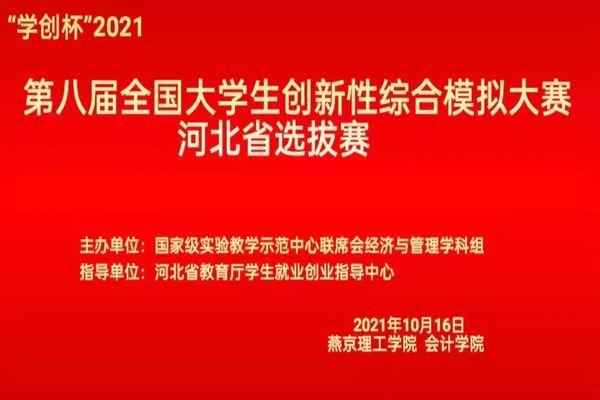 本网讯(会计学院 贾棚仁)近日,由国家级实验教学示范中心联席会经济学管理学科组举办、河北省教育厅指导的2021年第八届“学创杯”全国大学生创业综合模拟大赛河北省选拔赛圆满结束,燕京理工学院会计学院参赛队伍取得优异成绩,荣获一等奖3项,二等奖6项。