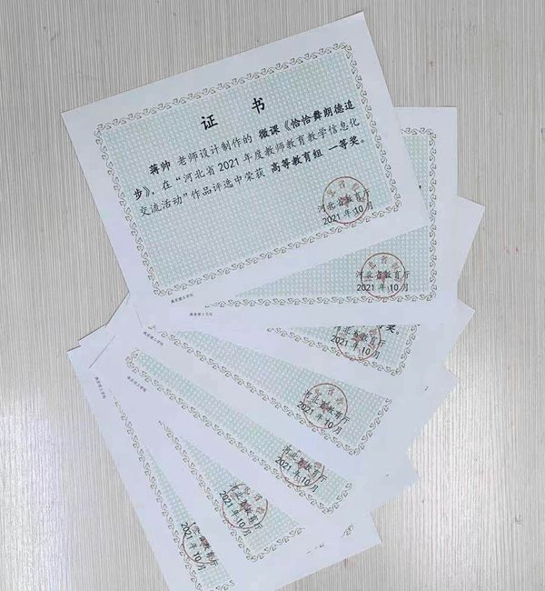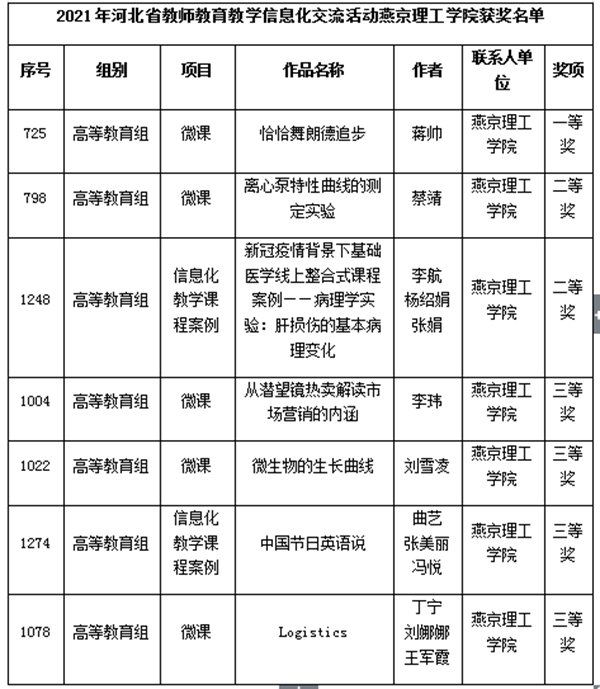 学校积极号召教师报名,经学院初审、学校择优推荐,全校共28件作品通过参赛审核,成功参加河北省教育教学信息化交流活动。体育学院蒋帅老师微课《恰恰舞朗德追步》荣获一等奖;工学院蔡靖老师微课《离心泵特性曲线的测定实验》和生命学院李航、杨绍娟、张娟老师的信息化教学课程案例《新冠疫情背景下基础医学线上整合式课程案例——病理学实验:肝损伤的基本病理变化》获得二等奖;国际商学院李玮老师微课《从潜望镜热卖解读市场营销的内涵》,工学院刘雪凌老师微课《微生物的生长曲线》,文法学院丁宁、刘娜娜、王军霞老师的微课《Logistics》及曲艺、张美丽、冯悦老师的信息化教学课程案例《中国节日英语说》获得三等奖。