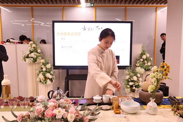讲解结束后,任艺青同学为大家表演了沏茶的方式,从最开始的洗茶具给茶杯进行清洁和提温,再进行剪茶叶、摇香、温杯、洗茶、分茶汤,最后品茶时,也是要先闻再后三品,方能真正体味到茶的甘冽香甜。