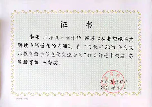 本网讯(国际商学院 何时雨)近日,河北省教育厅公布了2021年度教师教育教学信息化交流活动评选结果。国际商学院李玮老师的微课《从潜望镜热卖解读市场营销的内涵》荣获高等教育组三等奖。
