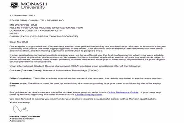 信息科学与技术学院电子信息工程专业1802班曹文颖获得约克大学、莫纳什大学名校offer。