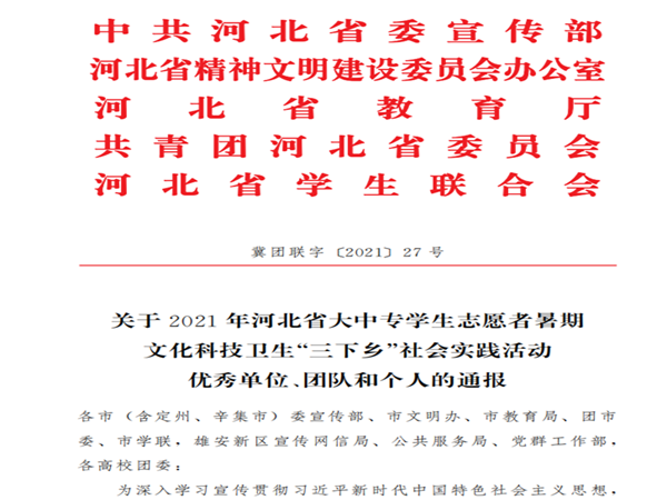 12月16日,团中央公布2021年全国大中专学生志愿者暑期“三下乡”社会实践活动优秀单位名单,我校团委荣获优秀单位称号。